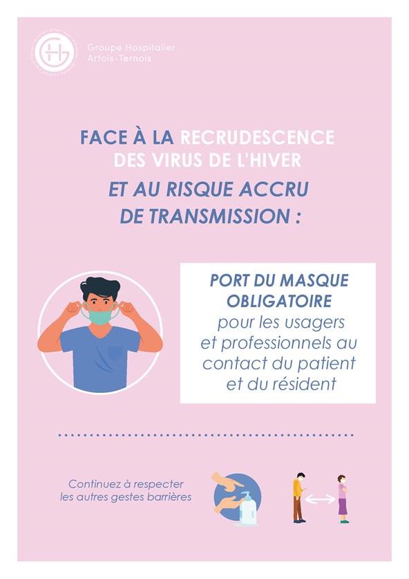 Nous vous rappelons que, face à la recrudescence des virus de l’hiver et au risque accru de transmission, nous vous demandons de bien vouloir porter le masque lorsque vous rendrez visite à vos proches au sein du Groupe Hospitalier Artois-Ternois et ses établissements.